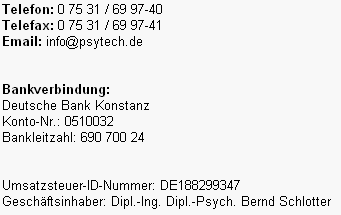 Der Inhalt dieser Homepage dient lediglich als Überblick für Interessenten, die sich über die Produkte und Dienstleistungen von psytech consulting informieren möchten und ist nicht als umfassende Darstellung der angesprochenen Themengebiete gedacht.